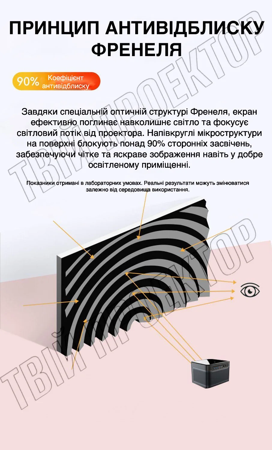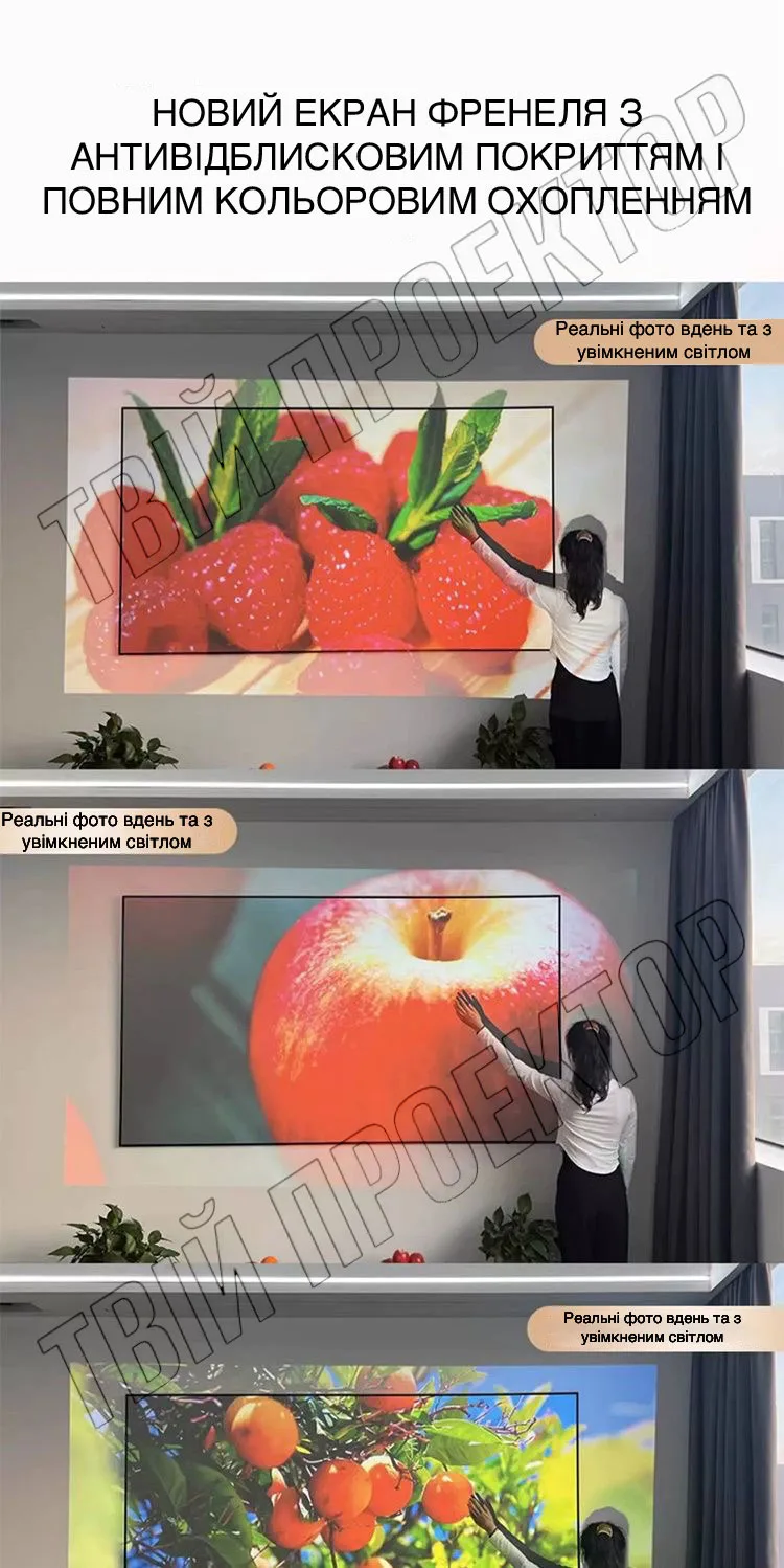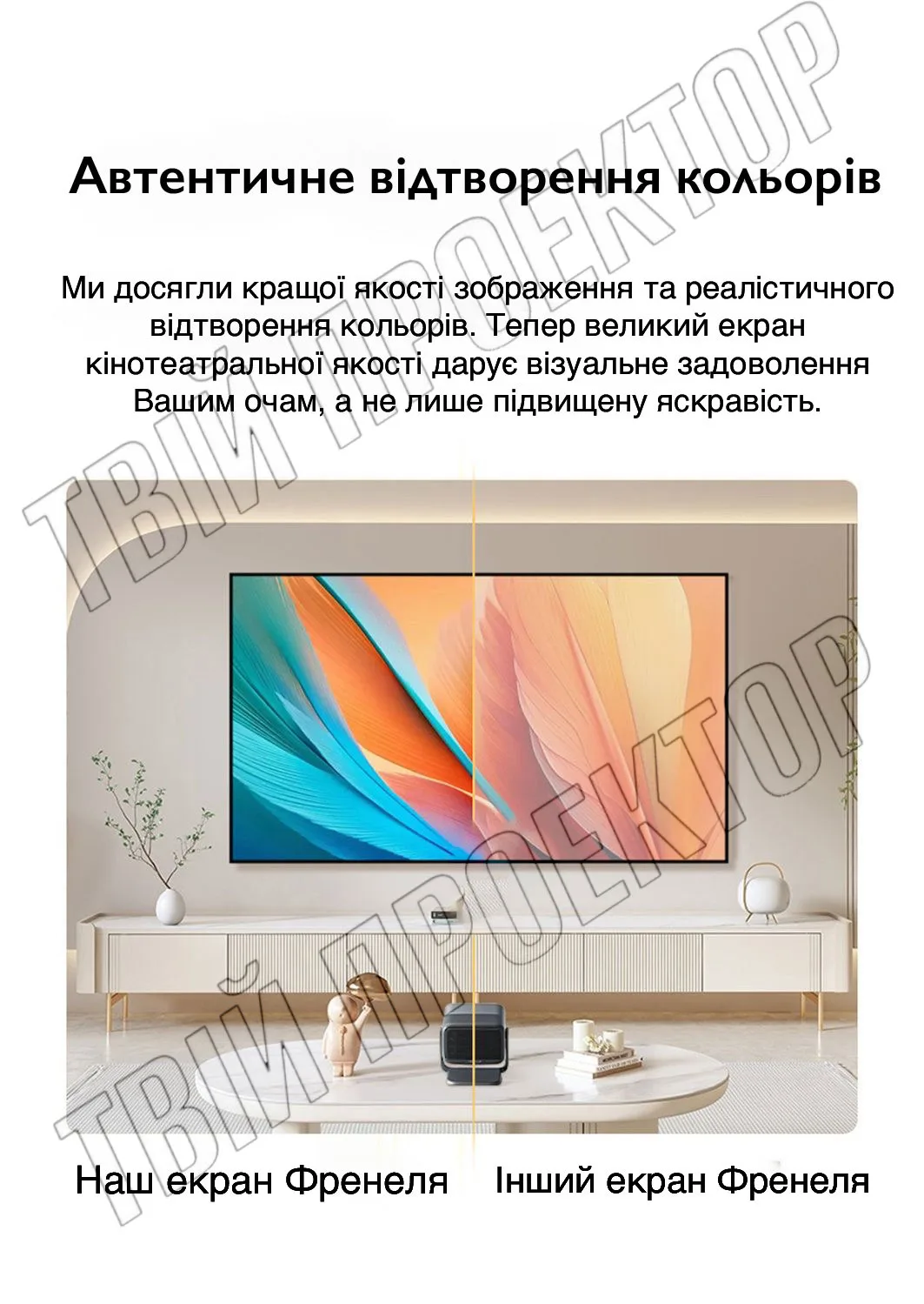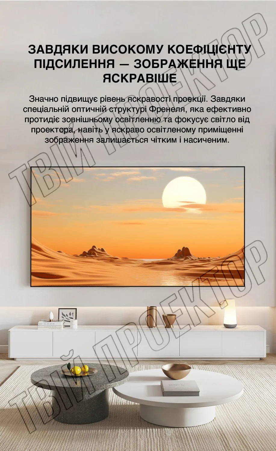 Екран Френеля (5 покоління) для проектора — це прорив в якісному домашньому кіно. Завдяки спеціальній оптичній структурі Френеля, він ефективно поглинає навколишнє світло та фокусує світловий потік від проектора, забезпечуючи чітке, яскраве зображення навіть у добре освітлених приміщеннях. Екран Френеля 5 покоління ідеально підходить для домашнього кінотеатру, презентацій, ігрових вечорів чи перегляду спортивних трансляцій — вдень і вночі. Зробіть свій перегляд дійсно кінематографічним!