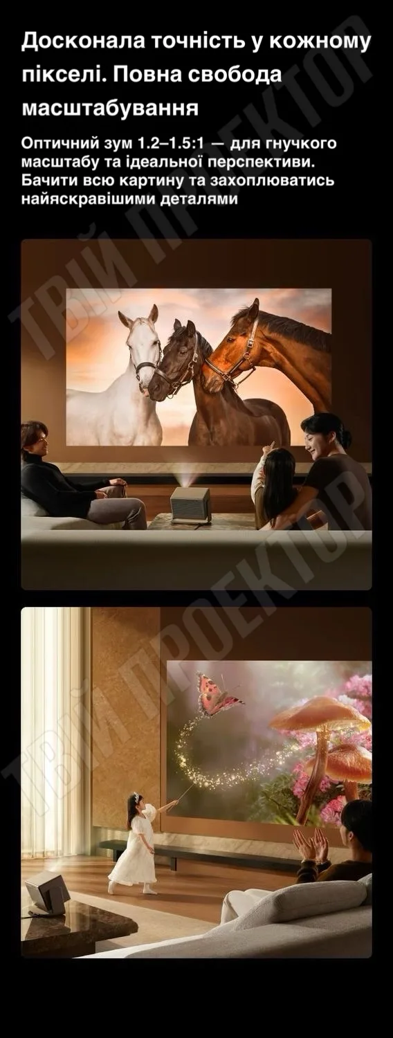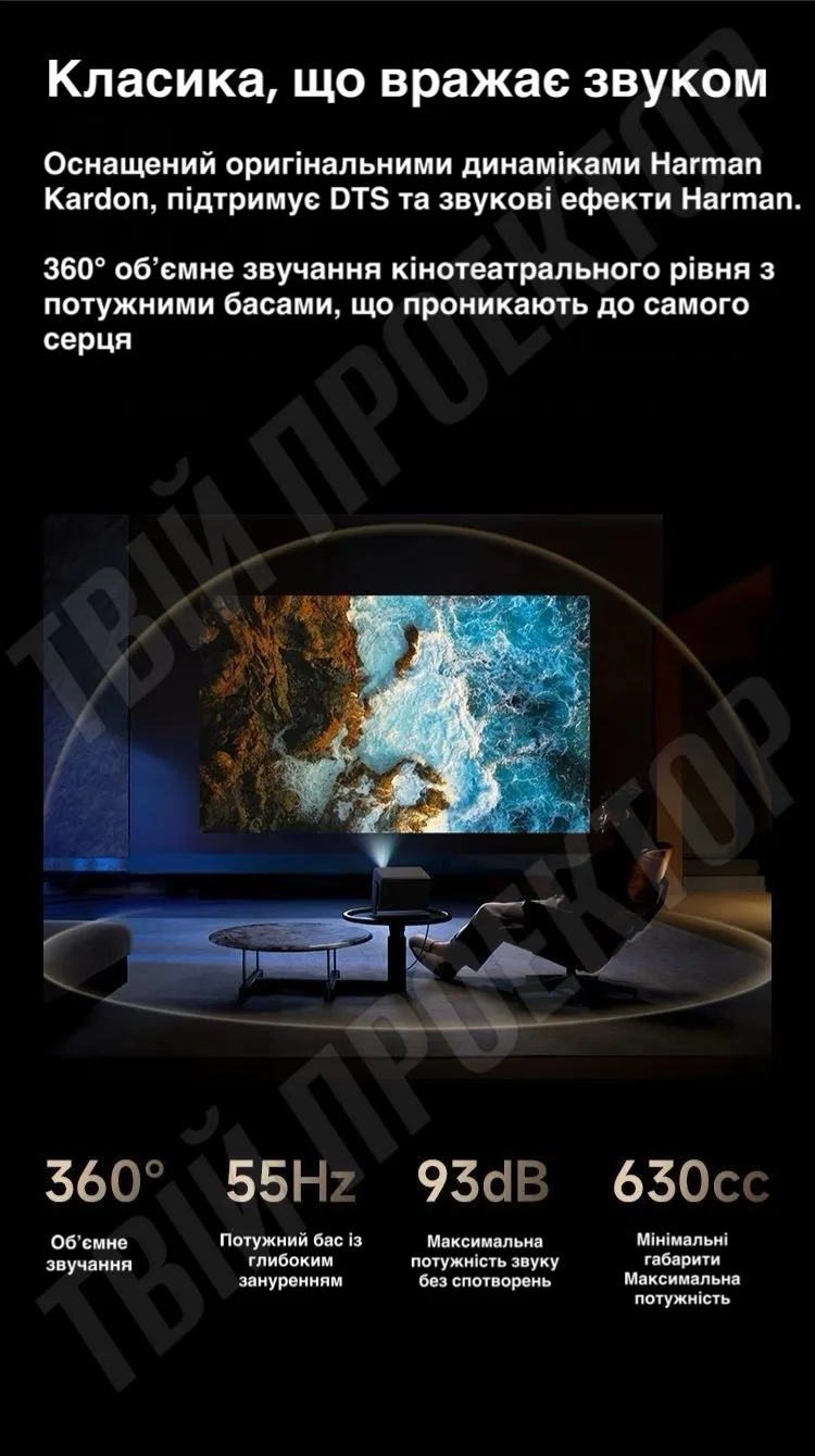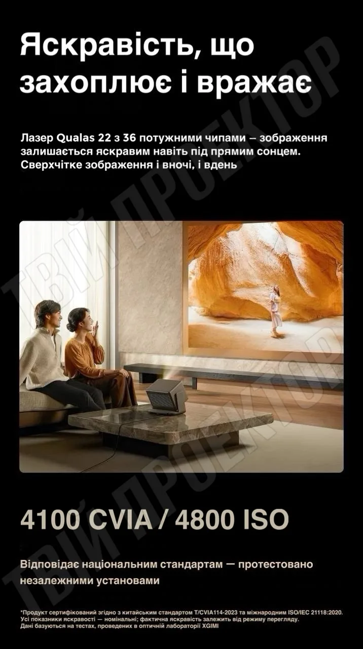 Серце пристрою — DLP-чіп нового покоління (0,47″ DMD, 472TP) та триколірний лазер Qualas22, які разом створюють зображення з надвисокою яскравістю 4100 CVIA, динамічною контрастністю 10000:1 та охопленням до 118% BT.2020. Надточна кольоропередача (Delta E < 0.8) робить кожен кадр максимально реалістичним, наближеним до професійних студійних стандартів.