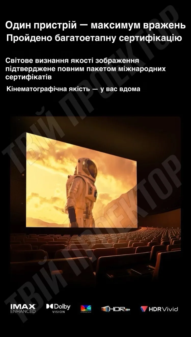 Професійні відеоформати та кінотеатральні стандарти забезпечують найвищу якість зображення за рахунок підтримки Dolby Vision, Imax Enhanced, Filmmaker Mode, HDR10+ та HDR Vivid. Це гарантує реалістичну передачу кольорів, глибокий контраст і точність деталей у будь-якому контенті — від кінофільмів до трансляцій і презентацій.