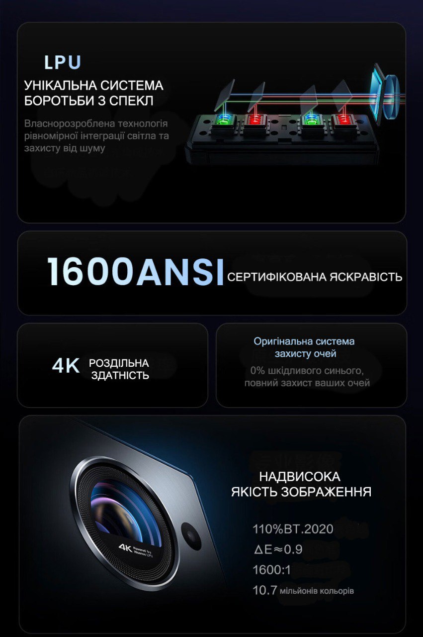 Рівень чорного цього проектора на рівні топових виробників, таких як BenQ та Epson, які коштують значно дорожче. Рівень точності передавання кольору DeltaE заявлений на рівні 0.9, тобто відхилення менше ніж сприймається оком людини.