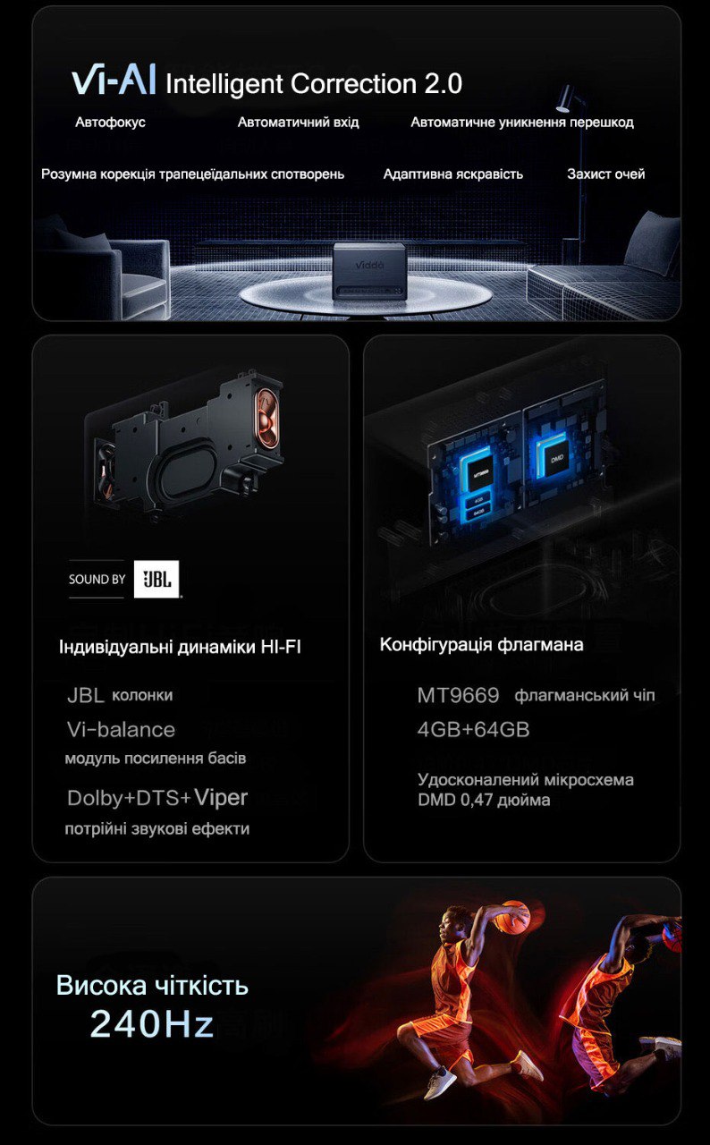 Це базовий проектор компанії Hisense Vidda C1S (європейський аналог Hisense C1 2023) – більше за саму компанію ви можете дізнатись в нашому блозі.