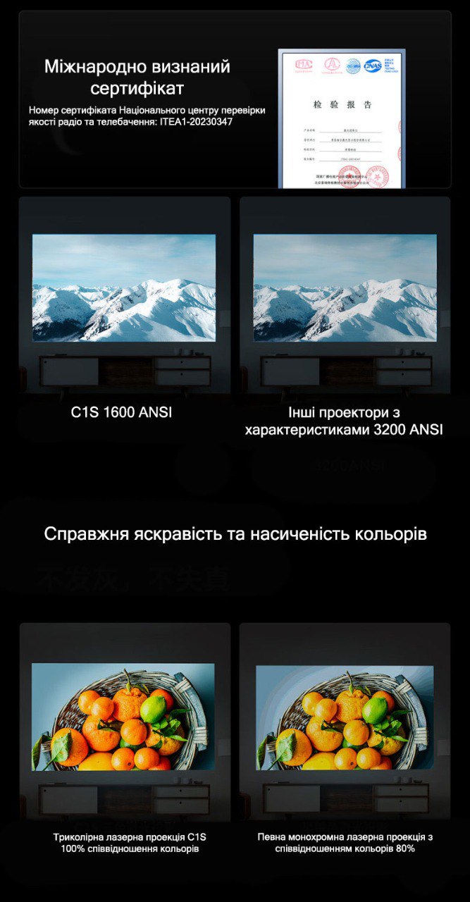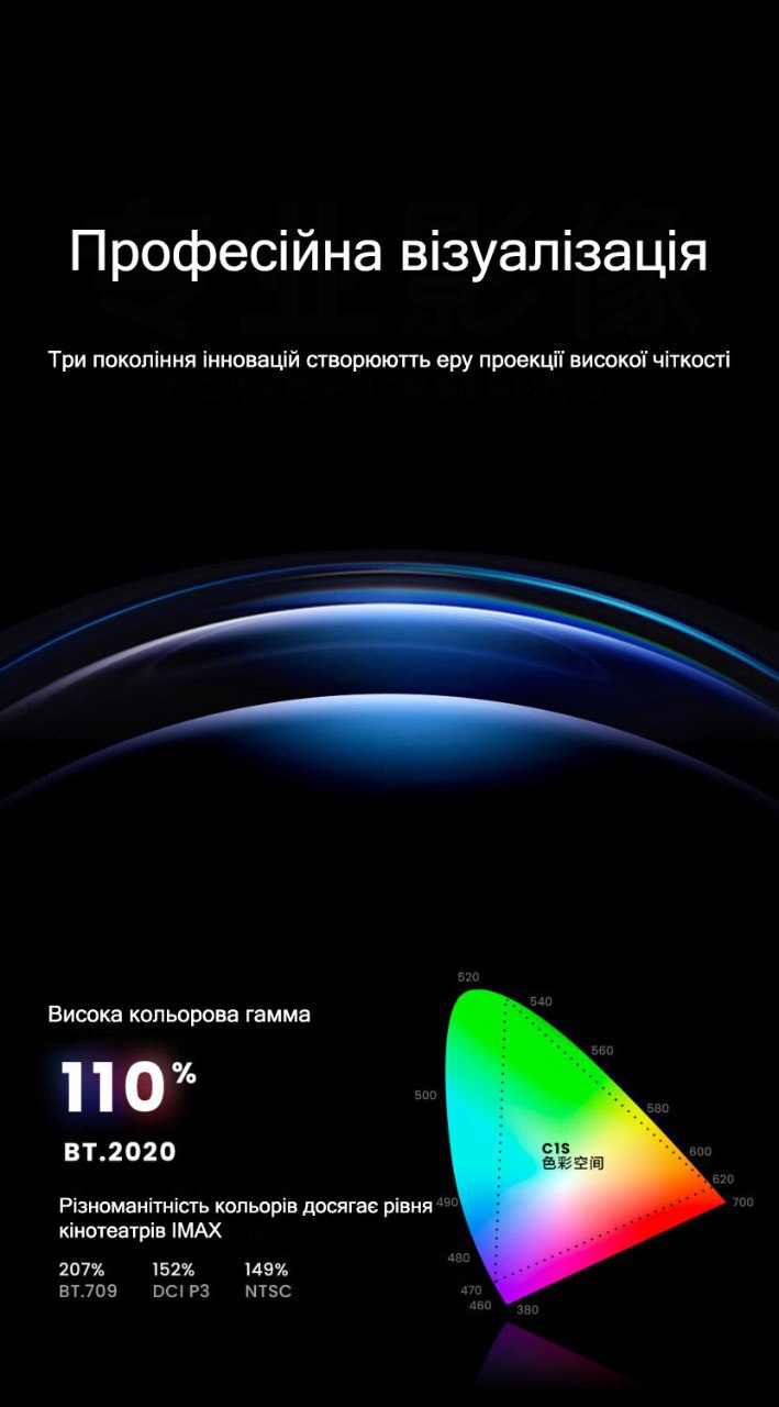 За рахунок використання окремих лазерів для кожного з кольорів (RGB) проектор Vidda C1S здатен відтворювати насичене зображення з колірним охопленням 110% по Rec. 2020. Це вигідно відрізняє цю модель від Dual Light версій (XGIMi H6 PRO та RS3).