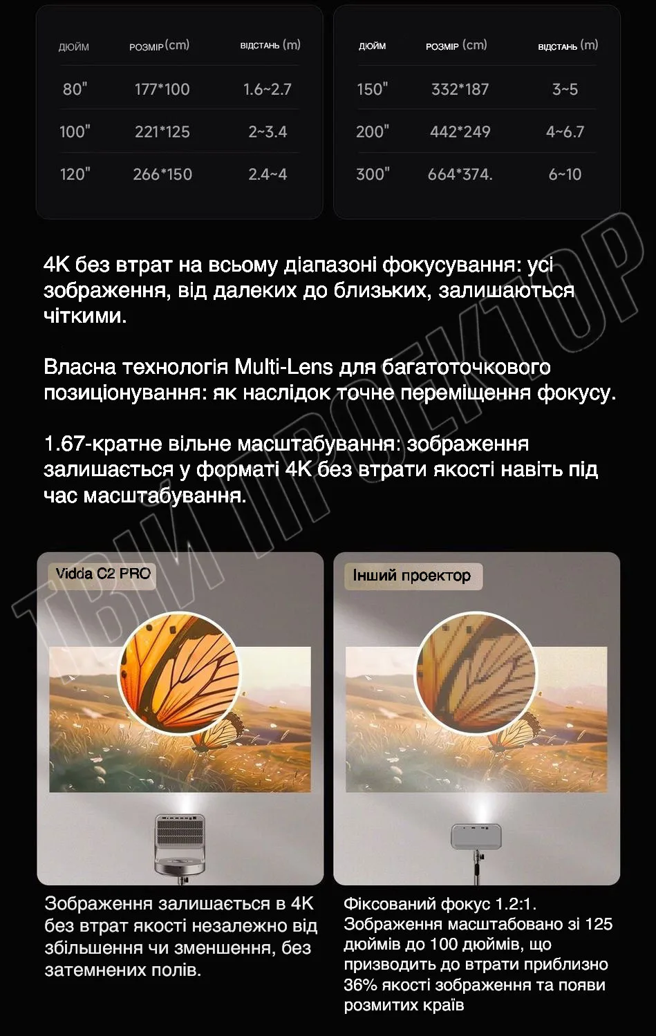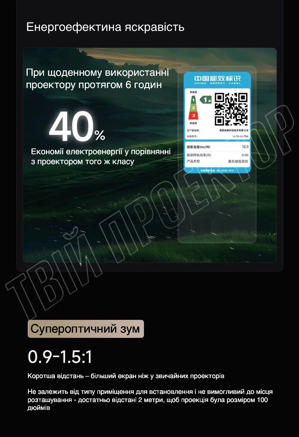 Вражаючий оптичний зум: Проекційне співвідношення варіюється від 0,9 до 1,5:1 завдяки оптичному зуму, що дозволяє легко адаптувати зображення під різні розміри екранів без втрати якості.